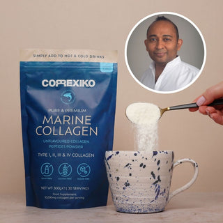 Correxiko Marine Collagen is available as a high-strength peptides powder, delivering 10,000mg of hydrolysed marine collagen per serving, or as an advanced capsule formula combining hydrolysed collagen with vitamin C, zinc, selenium and manganese to support normal collagen formation and skin health.