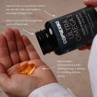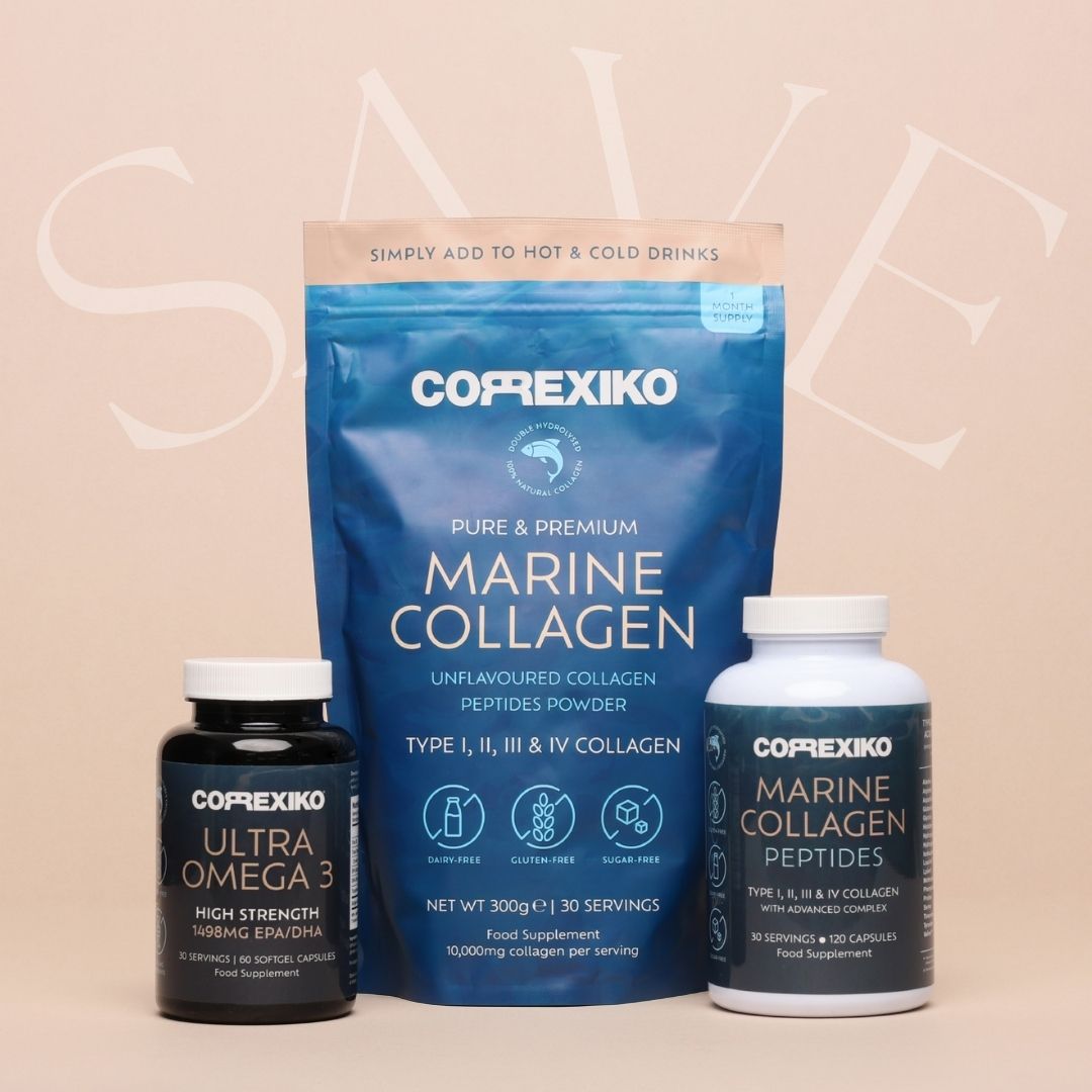 For truly healthy, resilient hair, it’s essential to nourish the scalp and support collagen formation from within. Correxiko’s Premium Omega-3 Capsules provide essential fatty acids EPA and DHA that help reduce inflammation around hair follicles, improve scalp circulation, and maintain optimal hydration — creating the ideal environment for strong, vibrant hair growth. Omega-3 also supports the body’s natural collagen synthesis by protecting cell membranes and enhancing nutrient delivery to the scalp and skin. When combined with Correxiko Marine Collagen, this powerful pairing helps reinforce the hair structure, restore shine, and promote fuller, more resilient hair from root to tip.
