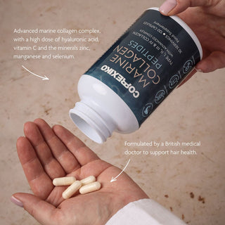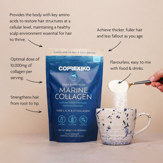 For visibly stronger, thicker, more radiant hair, combining Correxiko’s Marine Collagen Capsules and Powder delivers the most advanced results. The capsules offer a precise blend of double-hydrolysed marine collagen peptides with essential cofactors — Vitamin C, Hyaluronic Acid, Zinc, Manganese and Selenium — to actively support collagen production and nourish hair from the inside out. When paired with the pure, high-strength collagen peptides in the powder, your daily intake is elevated for enhanced absorption and accelerated benefits. Together, they create a powerful dual-action system — replenishing, strengthening and revitalising from within for your ultimate Dream Hair transformation.