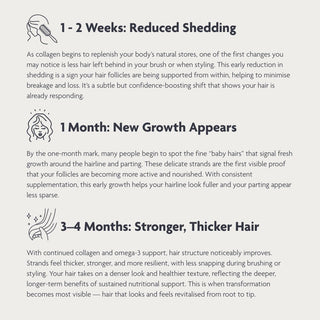 With consistent daily use, collagen and Omega-3 work together to strengthen hair from the inside out. Collagen peptides provide the amino acids needed to rebuild keratin and support stronger, more resilient strands, while Omega-3 fatty acids nourish the scalp, helping to reduce dryness and flakiness that can hinder healthy growth. Over time, you can expect hair that feels thicker, smoother and more supple, with improved shine and less breakage — revealing renewed vitality and visible strength month after month.