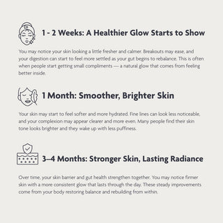 With consistent care, the benefits of nurturing your skin from the inside start to shine through. In just 1–2 weeks, a natural, healthy glow appears as your skin calms and digestion improves. By one month, your complexion looks smoother, brighter, and more hydrated, with fine lines appearing softer. After 3–4 months, these changes deepen into lasting radiance, as stronger skin and a balanced gut work together to support a firmer, more even, and resilient complexion.