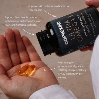 For radiant, youthful-looking skin, combining Correxiko Marine Collagen with Omega-3 delivers a powerful, dual-action approach. Collagen provides the essential peptides needed to strengthen skin structure, improve elasticity, and reduce the appearance of fine lines, while Omega-3 fatty acids support hydration, soothe inflammation, and protect skin cells from damage. Together, they enhance each other’s effects — collagen builds the framework, and Omega-3 ensures your skin stays nourished, supple, and glowing from the inside out. Regular use helps maintain a healthy complexion, promoting resilience, smoothness, and long-lasting radiance.
