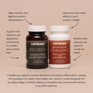 To maximise your skin’s health and radiance, we’ve included Correxiko Probio+ and Raw Vitamin C in the bundle. Probio+ supports a healthy gut microbiome, which plays a key role in reducing inflammation and promoting nutrient absorption — both essential for a clear, glowing complexion. Raw Vitamin C works synergistically by enhancing collagen synthesis, strengthening skin structure, and protecting against oxidative stress. Together, these additions help your skin look smoother, more resilient, and naturally radiant from the inside out.