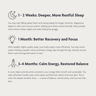 With regular support, better sleep becomes a natural part of your routine. Within 1–2 weeks, you may fall asleep more easily and stay asleep longer, waking feeling less groggy. By one month, improved sleep quality supports faster recovery, clearer thinking, and steadier energy throughout the day. After 3–4 months, your sleep cycle stabilises, leaving you refreshed, calm, and focused, with a lasting sense of balance and sustained energy from morning to night.