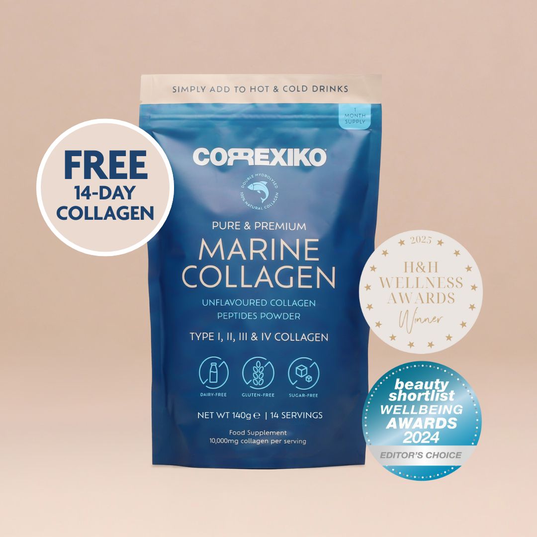 Correxiko Marine Collagen is available as a high-strength peptides powder, delivering 10,000mg of hydrolysed marine collagen per serving, or as an advanced capsule formula combining hydrolysed collagen with vitamin C, zinc, selenium and manganese to support normal collagen formation and skin health.