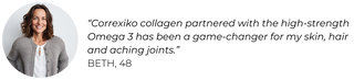 "Taking [Correxiko] collagen helped with some of my menopause symptoms. People have commented on how good my skin looks. I put the powder in lemon water first thing in the morning. Great start to the day."